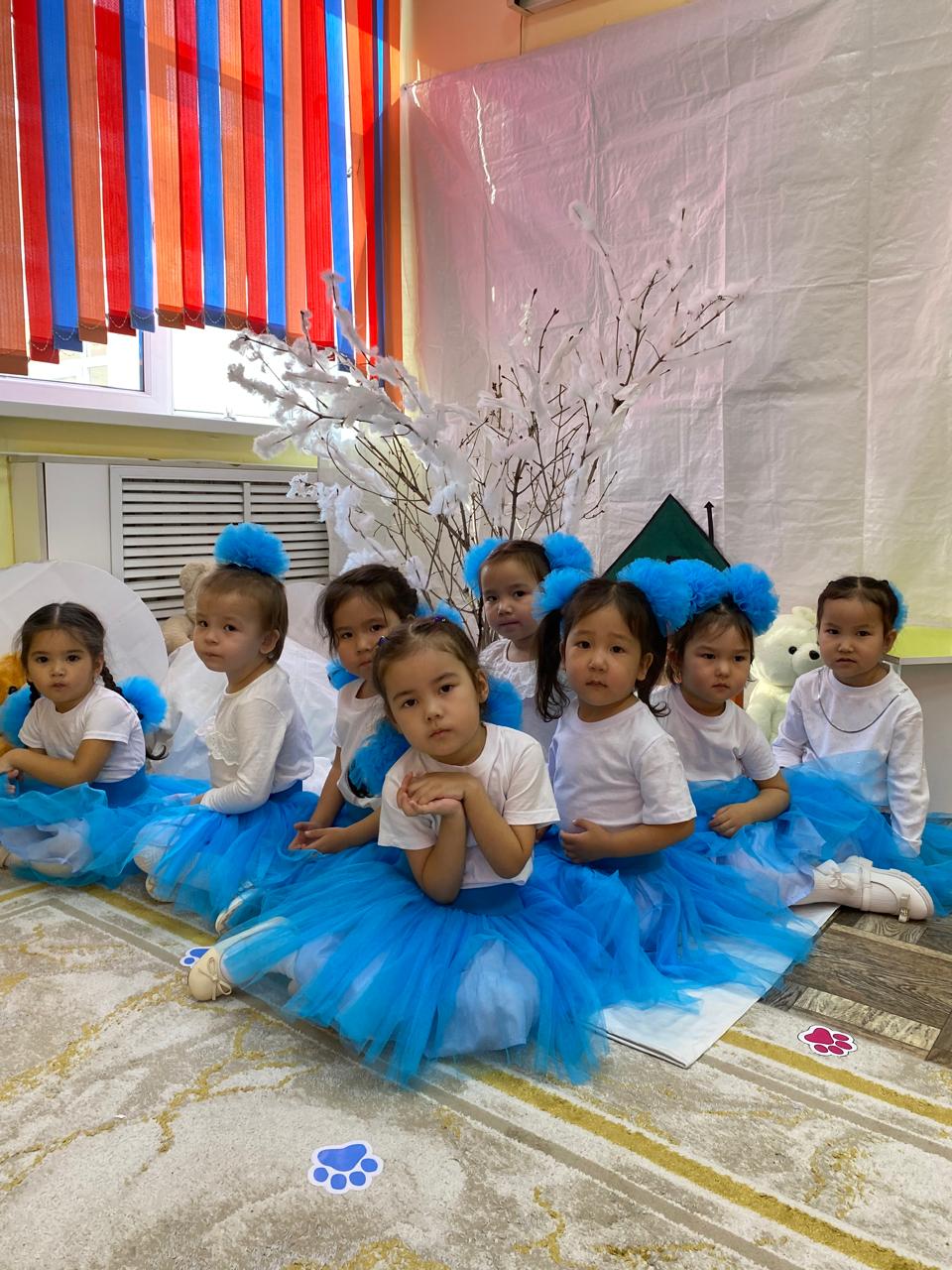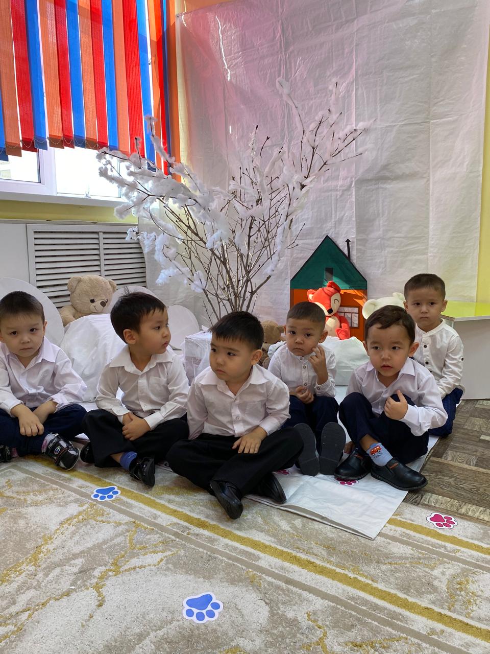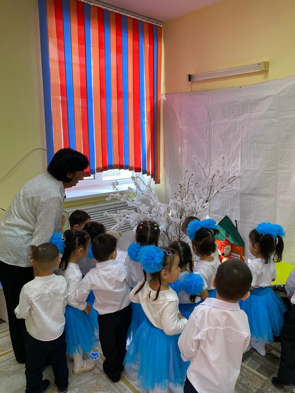 Балалар тәрбиешіге қызығушылықпен қарап, әңгімесін тыңдайды.