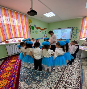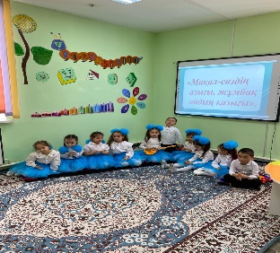 « Күншуақ » мектепалды даярлық тобы Тақырыбы: «Мақал — сөздің азығы, жұмбақ ойдың қазығы. Білім беру саласы: Коммуникация Оқу қызметі: Сөйлеуді дамыту. Мақсаты: Мақал түрлерімен таныстыру, ата бабамыздан қалған өсиет сөздері арқылы адамгершілікке, ойын нақты жеткізуге, тапқыр сөйлеуге үйрету. Сөз өнері арқылы балалардың дүниетанымын кеңейтуге тәрбиелеу. Балалардың ойлау қабілеттерін дамыту. Мақал-мәтелдер — халық даналығының, көрегендігінің айнасы, тіл байлығының алтын қазынасы. Мақал-мәтелдер — өмір шындығының көрінісі, халықтың кейінгі ұрпаққа қалдырған өсиеті, өмір сүру әрекетінің ережесі. Мақал-мәтелдер аз сөзбен терең мазмұнды ойды бере алады. Мақал-тоқсан ауыз сөздің тобықтай түйініп білдіріп, белгілі бір тұжырым жасайды. Ғажайып сәт: Таша баланың келуі. І-кезең «Ақылды балалар» — ақыл, нақыл сөздер ІІ-кезең «Кім тапқыр» суретке қарап мақал құрастыру ІІІ-кезең Сөз жұмбақ «Мақал» ІV-кезең «Шапшаң тіл» — жаңылтпаштар. Күтілетін нәтиже: Біледі; Мақал-мәтел , жұмбақ шешуді; Үйренді; Мақал туралы түсінеді; Тәрбиеші: Кадирбекова Айман Кенжебаевна