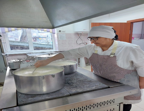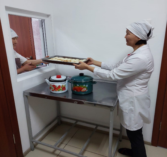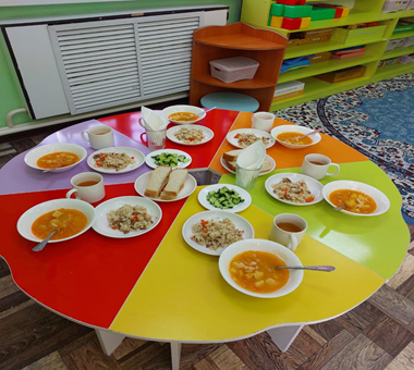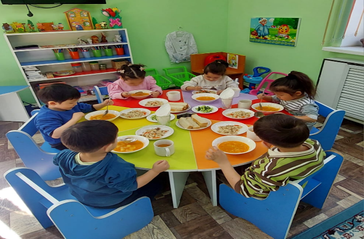 ҚР Үкіметінің қаулысымен бекітілген нормаларға сәйкес балабақшада дұрыс тамақтану ұйымдастырылған. Бала денсаулығы үшін салауатты тамақтанудың маңызы зор. Бармағынан бал тамған аспаздар бүлдіршіндерге перспективті ас мәзіріне сәйкес күнделікті дәмді әрі пайдалы тамақтар ұсынады. Таңғы асқа әр түрлі пайдалы ботқалар, түскі асқа дәрумендерге толы көкөніс салаттары мен бірінші, екінші тамақтар дайындалады. Сусындардың да бала ағзасына пайдасы зор. Біздің балабақшада балалардың тамақтану нормаларын ескеретін маусымдық мәзір жасалады. Бала күніне белгілі бір мөлшерде ет, май, айран, жеміс және т.б алу керек. «Балдәурен» балалар бақшасының медбикесі Байгабатова Н.М